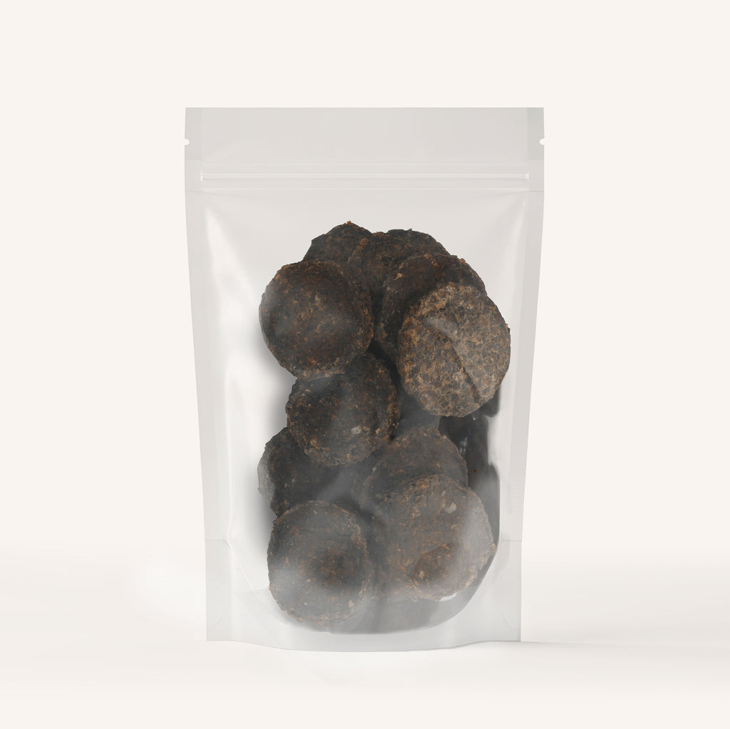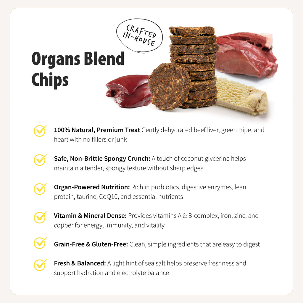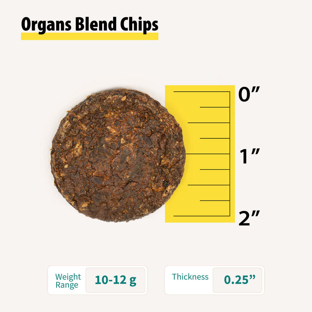 100% Natural Beef Organs Blend Chips - Gently dehydrated premium beef liver, green tripe, and heart with coconut glycerine for a safe, spongy-crisp texture and a hint of sea salt. Thin chips (2” diameter × 0.25” thick, 10-12g each) with rich organs flavor.