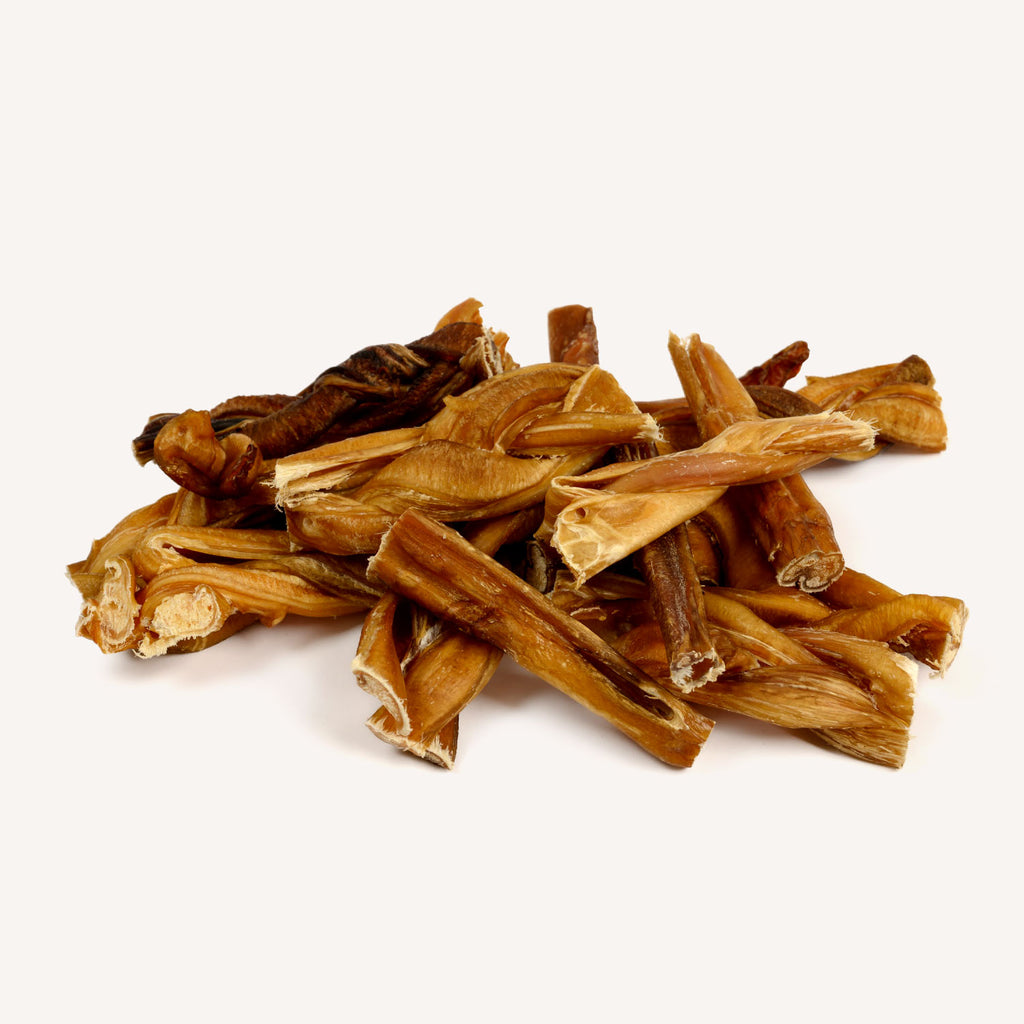 Ethically sourced and made from 100% South American bull pizzle. These premium treats are a good source of amino acids, known to support brain health as well as body and coat health. These long lasting chews also promote healthy teeth and gums. Easy to digest, high in protein and low in fat. No additives, fillers, hormones, chemicals or preservatives.