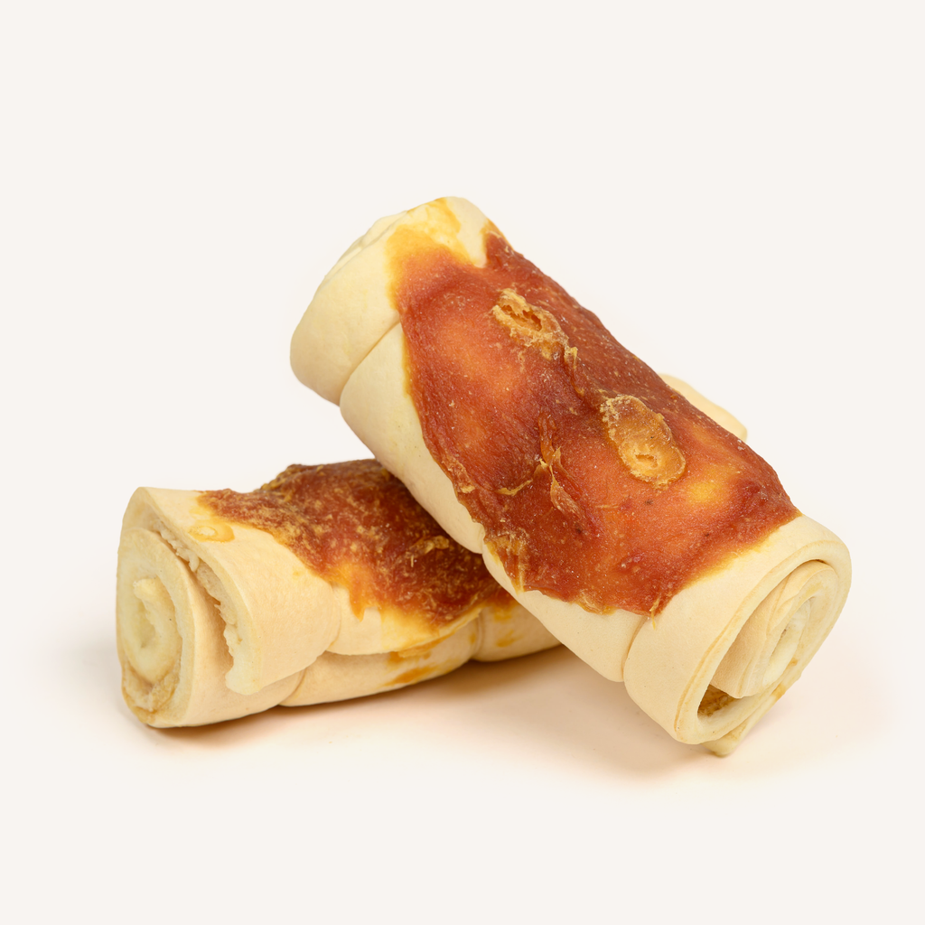 Unlike many "beef cheek" rolls on the market that are made from processed hide, skin layers, or rawhide-style alternatives, ours are crafted from genuine Beef Cheek, then basted with Chicken Breast for additional protein and drool-worthy flavor.