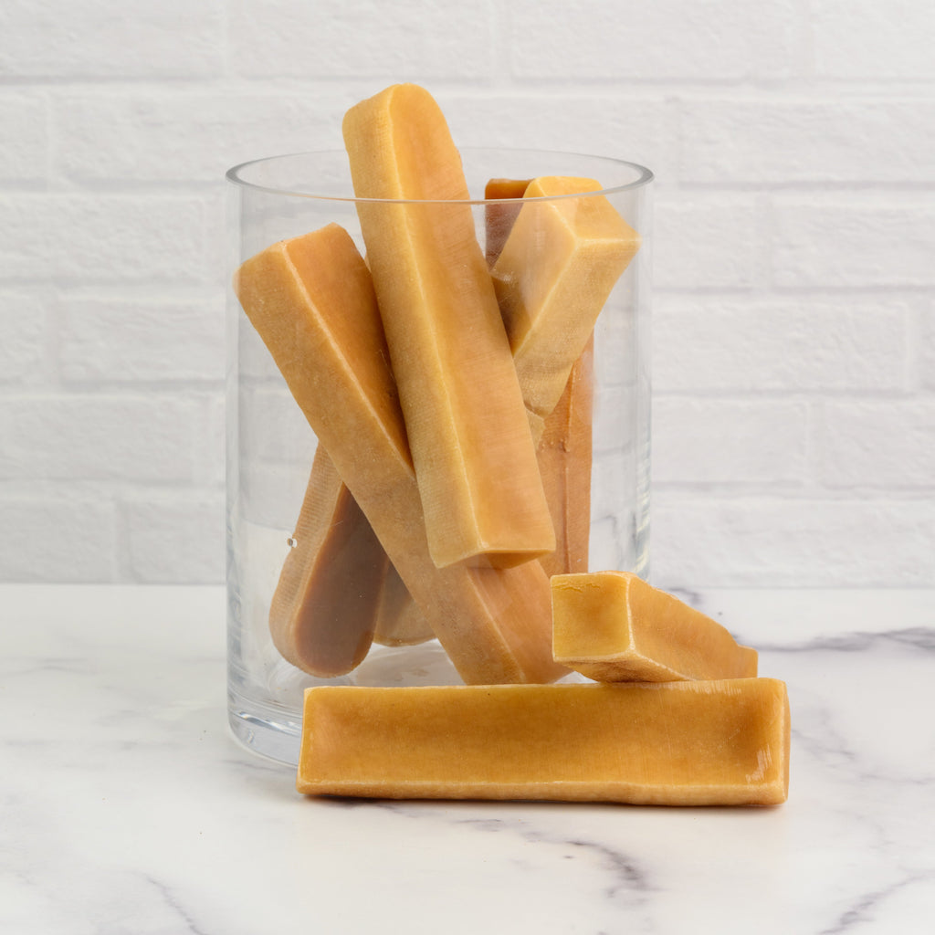 Handcrafted in Nepal using a traditional Himalayan method. Tough, rock-hard chew that softens with chewing.